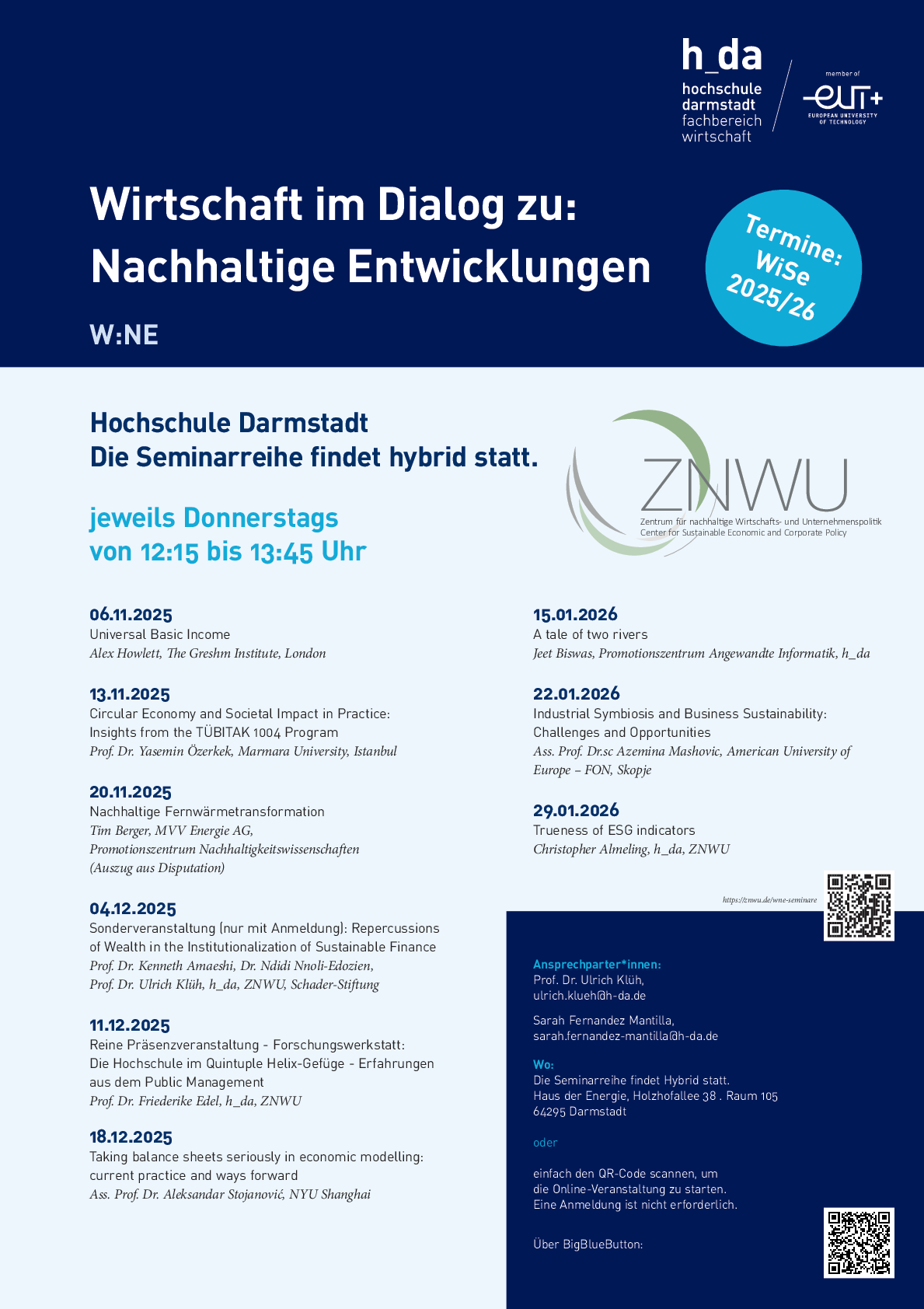 Das Forschungsseminar des Zentrums für nachhaltige Wirtschafts- und Unternehmenspolitik (ZNWU) findet donnerstags von 12:15 bis 13:45 Uhr statt. Auch Studierende sind herzlich willkommen. Eine Anmeldung ist nicht erforderlich.