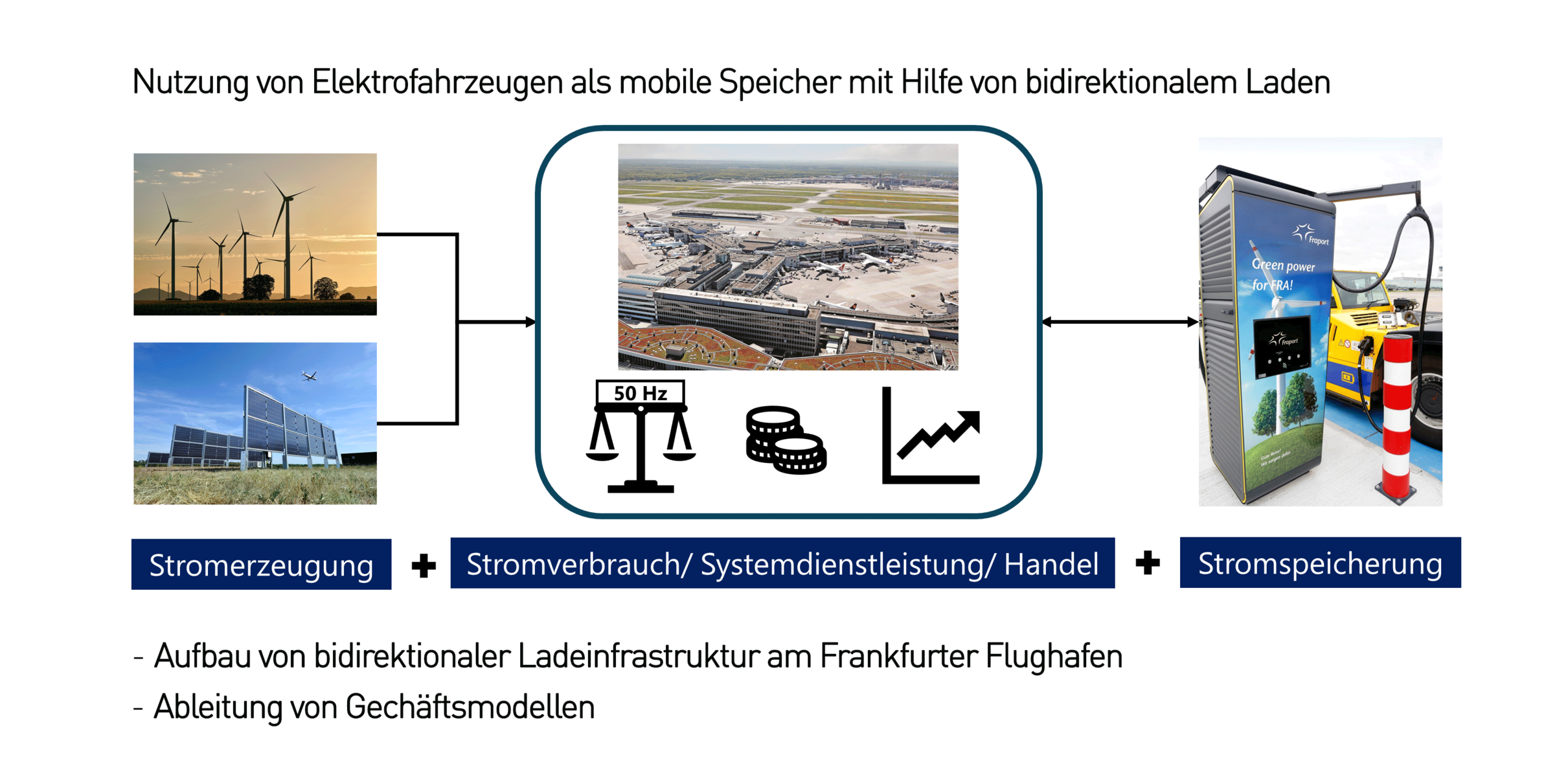 Ein zentrales Element des Projekts ist der Aufbau einer bidirektionalen Ladeinfrastruktur am Frankfurter Flughafen, die sowohl den Betrieb als auch die Erprobung dieser Konzepte im Realbetrieb ermöglicht. Auf dieser Basis sollen Geschäftsmodelle entwickelt werden, die technische Machbarkeit, wirtschaftliche Attraktivität und systemische Nutzenaspekte miteinander verbinden.